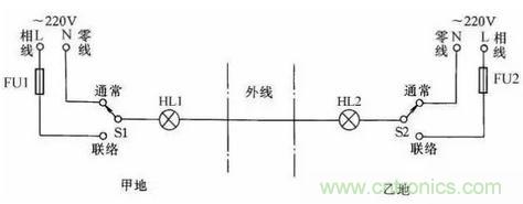 在某些生產(chǎn)過(guò)程中,需要兩地的生產(chǎn)人員能傳遞簡(jiǎn)單的信息,以協(xié)調(diào)工作。圖22所示是用一根導(dǎo)線傳遞聯(lián)絡(luò)信號(hào)線路。兩地中各有一只雙擲開關(guān)控制信號(hào)燈聯(lián)絡(luò),信號(hào)燈分別裝在兩地,一地一個(gè)。當(dāng)甲地向乙地發(fā)聯(lián)絡(luò)信號(hào)時(shí),撥動(dòng)開關(guān)S1,乙地的指示燈亮,待乙地完成甲地所指示的任務(wù)后,乙地可把開關(guān)撥至“聯(lián)絡(luò)”位置,通知甲地工作已完成。