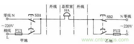 圖23所示線路可使甲乙兩地都能向總控制室發(fā)聯(lián)絡(luò)信號(hào)。當(dāng)甲地向總控制室發(fā)信號(hào)時(shí),按下按鈕SB1,控制室的電鈴告警。同理當(dāng)乙地向總控制室發(fā)信號(hào)時(shí)按下SB2即可。甲乙兩地信號(hào)可用信號(hào)鈴聲的時(shí)間長(zhǎng)短或次數(shù)區(qū)分。