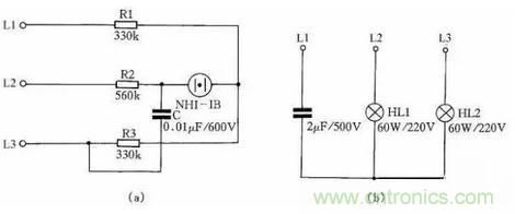 第二種方法是:用一只2μF、耐壓為500V的電容和兩只相同功率(220V/60W)的白熾燈泡,便可做成一個(gè)交流電源相序指示器,見圖25(b)。