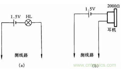圖27(a)、(b)是最簡(jiǎn)便的線路通斷檢測(cè)器。當(dāng)測(cè)得導(dǎo)線通路時(shí),燈泡會(huì)發(fā)光,耳機(jī)在通斷瞬時(shí)會(huì)發(fā)響;當(dāng)線路斷路時(shí),耳機(jī)不響,燈泡不亮。這種方法簡(jiǎn)單易行,非常適合初學(xué)電工制作工具儀表或代替萬(wàn)用表做測(cè)量,其優(yōu)點(diǎn)是攜帶方便。