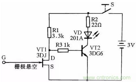 圖28所示是一感應(yīng)測(cè)電筆線路。它可方便地測(cè)出導(dǎo)線的斷芯位置。在用來(lái)測(cè)導(dǎo)線斷芯位置時(shí),在導(dǎo)線一端接上220V的電源相線,然后用感應(yīng)測(cè)電筆的探頭柵極靠近被測(cè)導(dǎo)線,并沿線移動(dòng)。如果發(fā)光二極管在移動(dòng)中突然熄滅,那么此處便是導(dǎo)線斷芯位置。