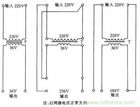 圖中的黑圓點(diǎn)表示繞組的同名端。如果將初、次級(jí)的連接線改為同名端相連;則輸出電壓將降低6.3V。采用這種接法;負(fù)載電流不得大于初、次級(jí)的額定電流。網(wǎng)路電壓如經(jīng)常比220V低(或高)30~40V;可選220V/36V的變壓器連接。