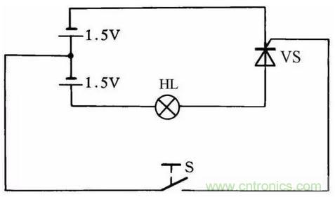 利用圖30所示的簡(jiǎn)便方法可檢查晶閘管的好壞。當(dāng)開關(guān)S斷開時(shí)燈泡不亮,而當(dāng)開關(guān)S閉合后燈泡發(fā)亮,說(shuō)明晶閘管能導(dǎo)通工作,否則晶閘管就是壞的。此方法對(duì)一般晶閘管均能測(cè)試,燈泡選用1.5V小電珠燈泡。