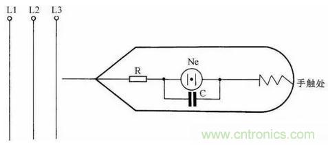 為了快速、準(zhǔn)確地判斷,可在一般的低壓驗(yàn)電筆的氖泡上并聯(lián)一只1500pF小電容,這樣在測(cè)強(qiáng)電時(shí),電筆照常發(fā)光。而測(cè)得的是感應(yīng)電時(shí),感應(yīng)電會(huì)通過(guò)電容再經(jīng)過(guò)人體被大地吸收掉,所以電筆不發(fā)光。在自制這種驗(yàn)電筆時(shí)應(yīng)把電筆上串聯(lián)的保護(hù)電阻放在測(cè)電筆線路的最前端以保障安全,見圖36。