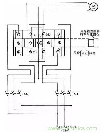 這里介紹一種常用限位器接線方法,這種限位器主要用于行車的上下電動(dòng)機(jī)限位。當(dāng)?shù)蹉^高于限制位置時(shí),它會(huì)使電動(dòng)機(jī)自動(dòng)斷開電源。這種方法一般是斷開主電機(jī)電源線,而不是用控制線控制接觸器通斷電動(dòng)機(jī)停止限位,其優(yōu)點(diǎn)是萬(wàn)一接觸器觸點(diǎn)熔在一起不能斷開時(shí),限位器同樣能起到保護(hù)限位的作用。其接線方法如圖38所示。