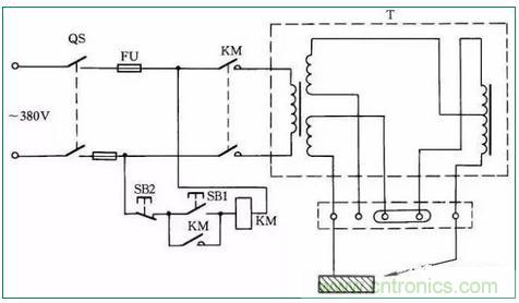 交流電焊機(jī)一般接法如圖39所示。當(dāng)合上刀閘QS時(shí),按下按鈕SB1,接觸器KM得電吸合;松開按鈕SB1時(shí),KM自鎖觸點(diǎn)自鎖,電焊機(jī)繼續(xù)得電工作。當(dāng)按下SB2時(shí),電焊機(jī)停止工作。