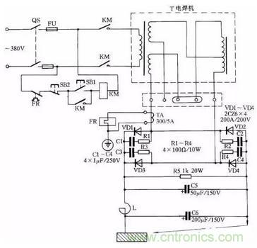 電路中VD1~VD4為4只硅整流二極管;R1~R4、C1~C4組成硅整流器件的過(guò)壓保護(hù)電路;FR為過(guò)流繼電器,保護(hù)硅整流器件。當(dāng)負(fù)載電流超過(guò)額定值時(shí),電流互感器次級(jí)電流相應(yīng)增加,帶動(dòng)繼電器FR動(dòng)作,F(xiàn)R常閉觸點(diǎn)打開,接觸器KM釋放,觸點(diǎn)打開切斷電焊機(jī)電源。硅整流器件用0.25kW風(fēng)扇作風(fēng)冷設(shè)備。圖中,C5為濾波電容,R5為泄放電阻。