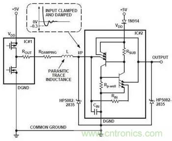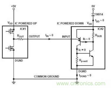 如果任何時候器件的數(shù)字輸入或輸出都超過VDD,可以在VDD串聯(lián)二極管(如下圖使用1N914)來阻止SCR觸發(fā)和隨后的閂鎖產生。這是因為二極管能夠防止寄生橫向PNP晶體管的基極電流從VDD引腳流出,從而防止SCR觸發(fā)