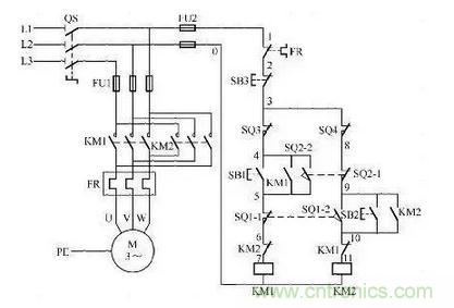 這個電路也很經典,其實它是控制電機正反轉的加強版。利用行程開關實現(xiàn)自動往返的效果,按下SB1啟動按鈕KM1自鎖,小車開始正向走,當碰到限位開關SQ1時,KM1線圈失電KM2自鎖,小車又反向運行。只要不按下SB3這個停止按鈕,它就會循環(huán)運行。