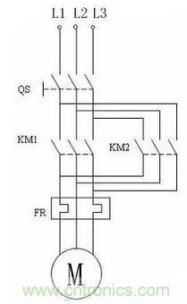 注意看KM1和KM2的相序,當接觸器常開觸點KM1閉合后,接在電動機上的相序是(從左至右)L1,L2,L3;當另一個接觸器的常開觸點KM2閉合后,接在電動機上的相序是(從左至右)L3,L2,L1。上文已經(jīng)說過了,改變相序就能改變電動機的轉(zhuǎn)動方向。因此,KM1閉合和KM2閉合,兩次電動機轉(zhuǎn)動的方向是相反的。