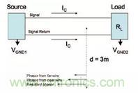 圖1:電路回路中的共模電流。電路中的源是一個(gè)數(shù)字信號(hào)(帶諧波),其負(fù)載被假定為阻性。因?yàn)檫h(yuǎn)端導(dǎo)線上的相電流和近端導(dǎo)線上的相電流的流向是相同的,所以其合成相量相較于差模電流產(chǎn)生的相量會(huì)更大。在這種情況下,為了限制輻射發(fā)射的水平,降低諧波成分的大小(減慢數(shù)字信號(hào)的上升/下降時(shí)間)或者轉(zhuǎn)移/限制共模電流是非常重要的。