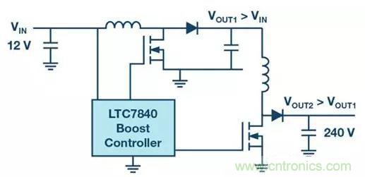 而另一個(gè)獲得較高升壓因子的方案就是使用多相 (Multi Output Phases)。以ADI公司的LTC7840芯片為例,當(dāng)中包含兩個(gè)升壓控制器。這使得實(shí)現(xiàn)兩相升壓概念變得容易。圖三顯示了電源電壓為12V的示例,輸出升壓至240V電壓。兩相升壓級(jí)將電壓分開增加,使得每級(jí)僅需要將電壓增加約4.5倍。