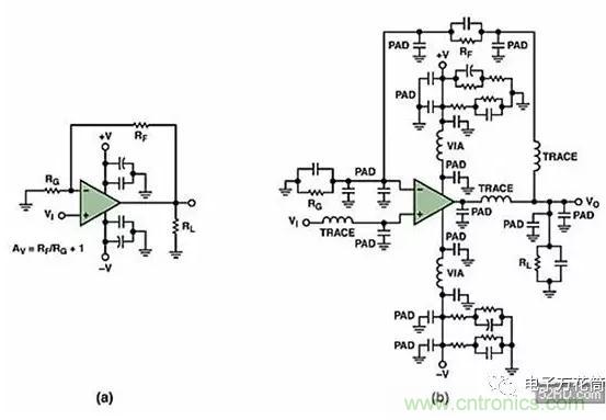 所謂寄生效應(yīng),按照字面意思就是那些出現(xiàn)在PCB板中并在電路中大施破壞、令人頭痛且原因不明的小故障。它們就是滲入高速電路中隱藏的寄生電容和寄生電感。其中包括由封裝引腳和印制線過(guò)長(zhǎng)所形成的寄生電感;焊盤(pad)到地、焊盤到電源平面和焊盤到印制線之間形成的寄生電容;通孔之間的相互影響,以及許多其他可能的寄生效應(yīng)。(圖三)(a)顯示一個(gè)典型的同相運(yùn)算放大器原理圖。但是,如果考慮寄生效應(yīng)的話,同樣的電路可能會(huì)變成圖三(b)那樣。