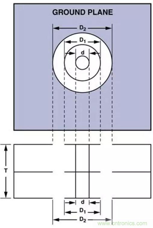 εr表示PCB材料的相對(duì)磁導(dǎo)率。T表示PCB的厚度。D1表示環(huán)繞通孔的焊盤直徑。D2表示接地平面中隔離孔的直徑。所有尺寸均以cm為單位。在一塊0.157 cm厚的PCB上一個(gè)通孔就可以增加1.2nH的寄生電感和0.5pF的寄生電容;這就是為什么在給PCB佈線時(shí)一定要時(shí)刻保持警覺的原因,要將寄生效應(yīng)的影響降至最小。
