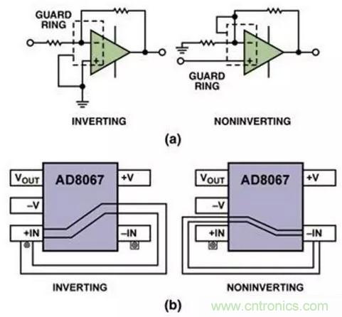 (公式七)保護(hù)環(huán),或者稱隔離環(huán),是運(yùn)算放大器常用的另一種遮罩方法,它用于防止寄生電流進(jìn)入敏感結(jié)點(diǎn)。其基本原理很簡(jiǎn)單,用一條保護(hù)導(dǎo)線將敏感結(jié)點(diǎn)完全包圍起來(lái),導(dǎo)線保持或者迫使它保持(低阻抗)與敏感結(jié)點(diǎn)相同的電勢(shì),因此使吸收的寄生電流遠(yuǎn)離了敏感結(jié)點(diǎn)。(圖十五)(a)顯示了用于運(yùn)算放大器反相配置和同相配置中保護(hù)環(huán)的原理圖。圖十五(b)則顯示用于SOT-23-5封裝中兩種保護(hù)環(huán)的典型佈線方法。