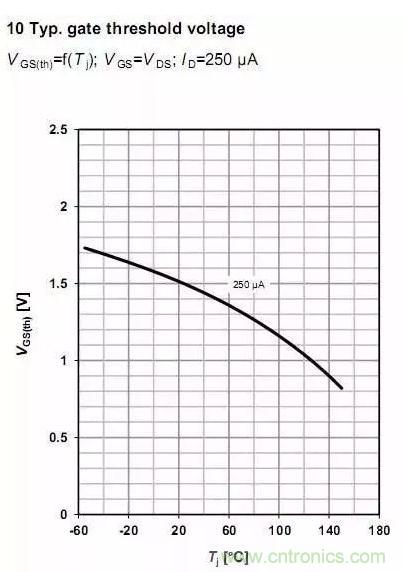 相信這個值大家都熟悉,但是Vgs(th)是負(fù)溫度系數(shù)有多少人知道,你知道嗎?(下面兩圖分別來自BSC010NE2LS和IPP075N15N3 G datasheet.)