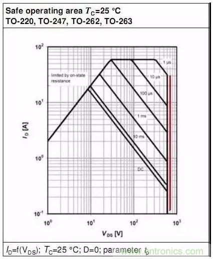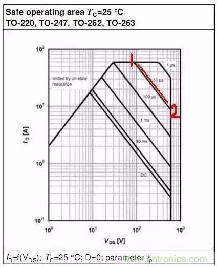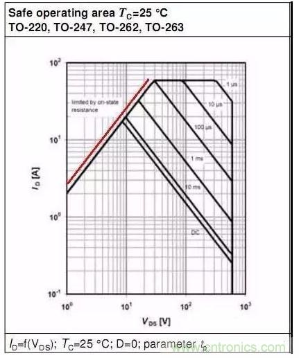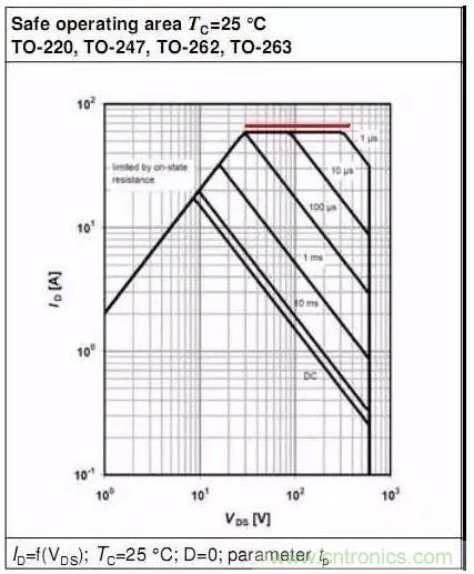 此圖中:當(dāng)VDS=1V時,Y軸對應(yīng)的ID為2A,Rds=VDS/ID=0.5R ==>Tj=150℃時,Rds(on)約為0.5R.當(dāng)VDS=10V時,Y軸對應(yīng)的ID為20A,Rds=VDS/ID=0.5R ==>Tj=150℃時,Rds(on)約為0.5R.所以,此部分曲線中,SOA表現(xiàn)為Tj_max時RDS(on)的限制.