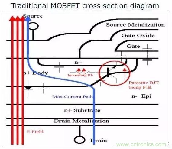 在MOSFET的結(jié)構(gòu)中,實際上是存在一個寄生三極管的,如上圖。在MOSFET的設(shè)計中也會采取各種措施去讓寄生三極管不起作用,如減小P+Body中的橫向電阻RB。正常情況下,流過RB的電流很小,寄生三極管的VBE約等于0,三極管是處在關(guān)閉狀態(tài)。雪崩發(fā)生時,如果流過RB的雪崩電流達(dá)到一定的大小,VBE大于三極管VBE的開啟電壓,寄生三極管開通,這樣將會引起MOSFET無法正常關(guān)斷,從而損壞MOSFET。