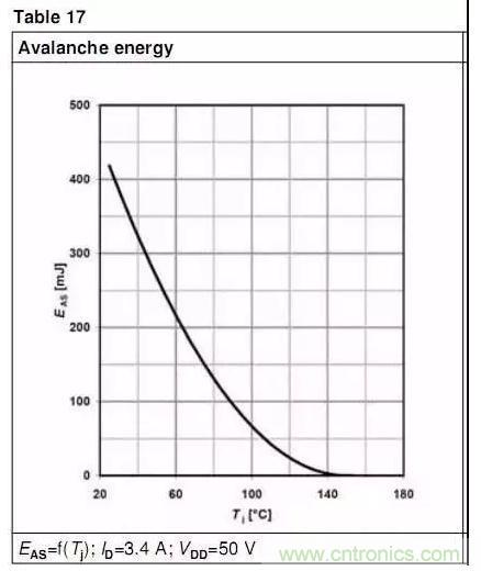 計算出來EAS后,對比datasheet上的EAS值,若在datasheet的范圍內(nèi),則可認(rèn)為是安全的(當(dāng)然前提是雪崩電流<IAR)同時,還得注意,EAS隨結(jié)溫的增加是減小的,如下圖: