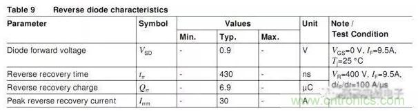 VSD,二極管正向壓降 ==>這個參數(shù)不是關(guān)注的重點,trr,二極管反向回復(fù)時間 ==>越小越好,Qrr,反向恢復(fù)電荷 ==>Qrr大小關(guān)系到MOSFET的開關(guān)損耗,越小越好,trr越小此值也會小