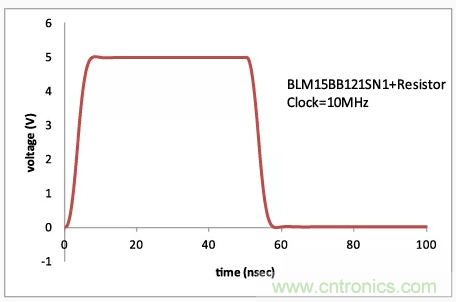 如果在數(shù)字電路中使用鐵氧體磁珠,則可能會(huì)發(fā)生波形中出現(xiàn)過沖和下沖的情況。(圖2)