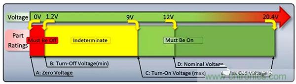 從1.2VDC到9VDC, 繼電器處于不確定的范圍內(nèi)。(黃色區(qū)域)