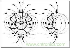 磁芯的作用就好象它在線圈繞組的間隙處裂為兩半時(shí)所表現(xiàn)出來的效果一樣。每個(gè)繞組在環(huán)形線圈一半的區(qū)域內(nèi)產(chǎn)生磁場,意指穿過空氣的磁場必定會(huì)形成自封閉回路,下圖是環(huán)形磁芯和差模電流磁路的示意圖。