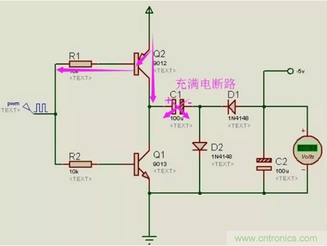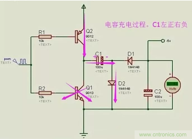 當(dāng)PWM為低電平時(shí),Q2關(guān)閉,Q1打開,C1開始放電,放電回路是C1-C2-D1,這實(shí)際上也是對(duì)C2進(jìn)行充電的過(guò)程。C2充好電后,下正上負(fù),如果VCC的電勢(shì)為5點(diǎn)幾伏,就可以輸出-5V的電壓了。