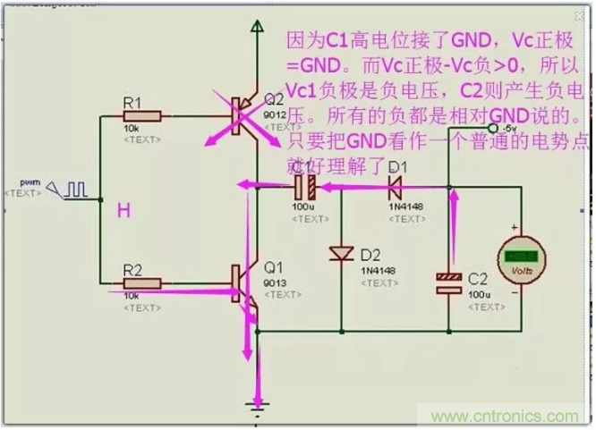 3、電容C1作為電源,C1高電勢(shì)極串聯(lián)在參考點(diǎn)。C1放電,從C2續(xù)流,產(chǎn)生負(fù)電壓。