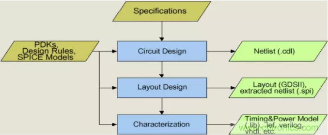 工程實踐中,從定義系統(tǒng)芯片參數(specifications)完成后,人們常常將最常見的數字集成電路中標準邏輯單元的版圖設計過程簡化為電路設計(circuit design)、版圖設計(layout design)和特征化(characterization)等三個步驟,見圖1簡化的版圖設計流程圖。在實踐中,版圖設計類型又分為: 1)標準版圖設計,2)半定制版圖設計,和3)全定制版圖設計。