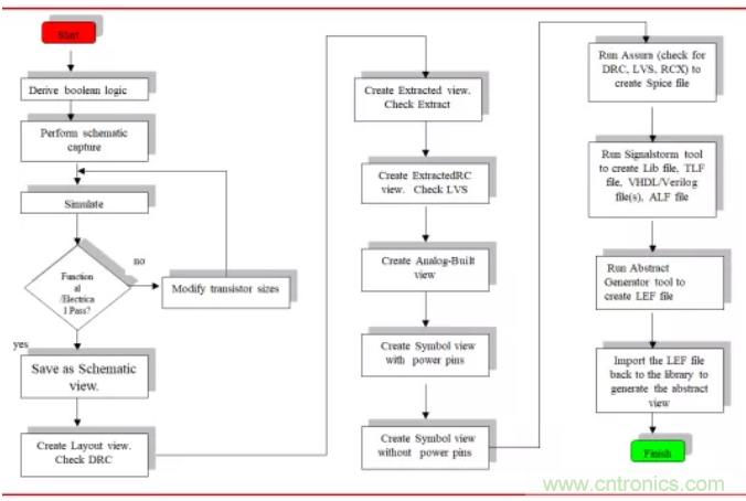 對于數字電路中的標準單元設計,是從布爾邏輯(Boolean logic)描述并定義單元的邏輯關系開始,接著是電路設計(schematic capture或circuit design)與電路仿真(circuit simulation),而后開始版圖設計。版圖設計需要符合制造工藝規(guī)則檢查(design rule check,DRC)和版圖電路一致性檢查(layout versus schematic,LVS)通過才算完成,這時,版圖設計的結果用“圖形顯示系統(tǒng)第二版”(graphic display system II,GDSII)文件記載,并作為芯片制造中制作掩模板(mask)的依據。數字電路的標準單元和I/O單元完成版圖設計后,還要做寄生參數(電阻R電容C)提取(parasitic extraction,RCX),供電路設計者作進一步擬合優(yōu)化處理,這種反標方法(back-annotation)也是芯片級設計的重要步驟之一。圖2給出了比較完整的版圖設計全流程圖。
