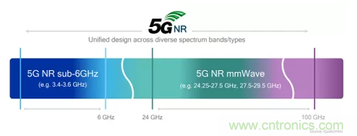 5G通信采用的頻段規(guī)范稱作“5G新空口”(5G New Radio,5G NR),使用6 GHz以下頻率以及毫米波波段,見圖5。數據率為10~20Gbps