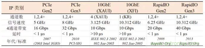物聯(lián)網和5G聯(lián)網通信中除了信號收發(fā)單元(transceiver, TRX 以及TX/RX)設計芯片之外,離不開專用的系統(tǒng)芯片SoC,其中高性能與高速核心IP往往決定了SoC的性能和速度。常見的高性能與高速核心IP有: PCIe, 10 Gigabit Ethernet (10 GbE), RapidIO, SerDes, USB等。表1列出了幾種物聯(lián)網和5G時代常用的高性能與高速IP的信號速度和數據率。