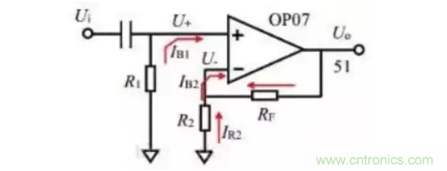 如果 IB1=IB2,那么選擇 R1=R2//RF,可以使電流形成的失調(diào)電壓會(huì)消失。但實(shí)際中IB1=IB2很難滿足