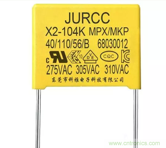 X電容是跨接在電力線兩線之間,即“L-N”之間,X電容器能夠抑制差模干擾,通常采取金屬化薄膜電容器,電容容量是uF級。X電容多數(shù)是方型,也就是類似于盒子的形狀,在它的表面一般都標有安全認證標志、耐壓字樣(一般有AC300V或AC275V)、依靠標準等信息。X電容雖然是CBB電容的一種,但是并不是每一種CBB電容就能做X電容必須要達到安規(guī)標準。