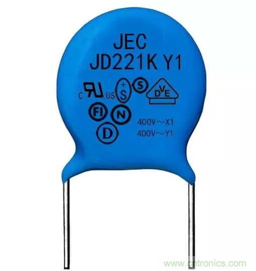 Y電容通常都是陶瓷類電容器,一般成隊出現(xiàn),多數(shù)是扁圓形外觀,顏色呈現(xiàn)藍色,能夠抑制共模干擾,Y電容容量是nF級?;诼╇娏鞯闹萍s,Y電容量不可很大。Y電容多數(shù)適用于隔離場合,按照IEC標準,Y1產(chǎn)品電氣間隙最小為8.0㎜,Y2產(chǎn)品電氣間隙不低于6.3㎜,作為隔離產(chǎn)品,安全距離要做夠,避免高壓通電發(fā)生拉弧現(xiàn)象。