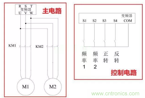 我們通過兩個(gè)接觸器實(shí)現(xiàn)變頻器對(duì)電機(jī)驅(qū)動(dòng)的切換,在控制部分我們采取最簡單的使用外部端子來實(shí)現(xiàn)電機(jī)的啟動(dòng)、停止以及速度的調(diào)節(jié)。那對(duì)于雙速電機(jī),我們采用多段速調(diào)頻每個(gè)端子S1、S2就代表一個(gè)速度,這個(gè)速度的大小我們能在變頻器參數(shù)中進(jìn)行自定義設(shè)定比如20Hz,50Hz等。那對(duì)于正反轉(zhuǎn)控制電機(jī)就更簡單了,我們只需要控制S3和S4端子的閉合就能實(shí)現(xiàn)。以上只是簡單的舉例說明,在我們實(shí)際應(yīng)用當(dāng)中還要考慮變頻器與電機(jī)容量的關(guān)系,不能過載運(yùn)行,如果兩個(gè)電機(jī)參數(shù)不一樣,我們還必須對(duì)變頻器進(jìn)行詳細(xì)參數(shù)調(diào)節(jié),可以把兩臺(tái)電機(jī)的控制參數(shù)都輸入到變頻器中,到時(shí)候用到哪臺(tái)就調(diào)取其參數(shù)。比如頻率設(shè)定源組合、命令源、加減速時(shí)間、可以通過端子進(jìn)行切換。