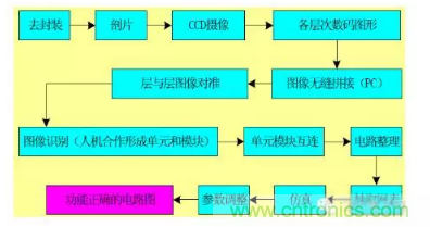用大俗話來(lái)說(shuō),找一塊有用的芯片,照照相、制制版、提提圖、畫畫圖、仿仿真,芯片電路就反求了出來(lái);編編工藝、設(shè)計(jì)工裝、將生產(chǎn)線開動(dòng),芯片又做了出來(lái);再做做測(cè)試、進(jìn)行老化,芯片就可以上市了。這就是集成電路反向開發(fā)的各道工序、完整流程。下面這張圖就說(shuō)明了全過(guò)程。