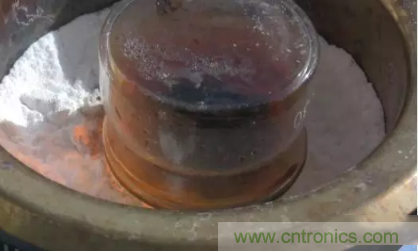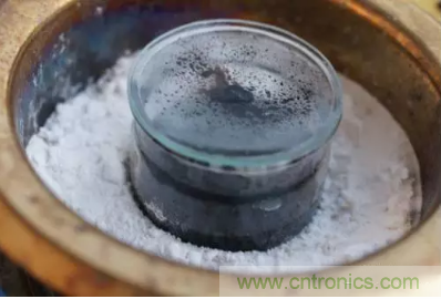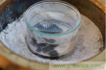 首先把要拆解的芯片放置在裝了濃硫酸的容器里,容器需要蓋住,但不能嚴(yán)實(shí),這樣里面的氣體才能漫溢出來(lái)。把容器里的濃硫酸加熱到沸騰(大約 300 攝氏度),在瓶底的周圍鋪上蘇打粉——用來(lái)預(yù)防意外飛濺出來(lái)的硫酸液和冒出來(lái)的硫酸氣體。