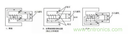 由永久磁鐵保持釋放狀態(tài),加上工作電壓后,電磁感應(yīng)使銜鐵與永久磁鐵產(chǎn)生吸引和排斥力矩,產(chǎn)生向下的運動,最后達(dá)到吸合狀態(tài)。
