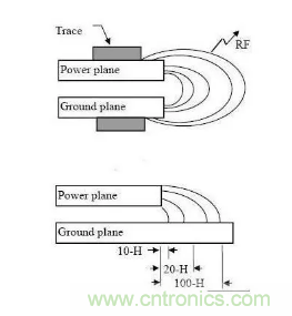這個規(guī)則經(jīng)常被要求用來作為降低來自0V/電源平面結(jié)構(gòu)的側(cè)邊射擊發(fā)射技術(shù)(抑制邊緣輻射效應(yīng))。但是,20H規(guī)則僅在某些特定的條件下才會提供明顯的效果。
