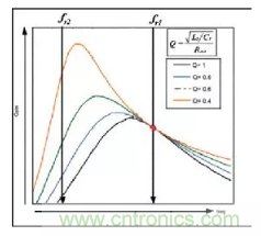 如果使用圖形表示諧振單元的增益,我們就得到圖3所示的曲線,不難看出,圖形變化與Q值相關(guān)。