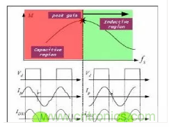 分析一下諧振頻率的方程式就會(huì)發(fā)現(xiàn),在高于峰值增益頻率時(shí),諧振網(wǎng)絡(luò)的輸入阻抗是感抗,諧振網(wǎng)絡(luò)的輸入電流(Ip)滯后于諧振網(wǎng)絡(luò)的輸入電壓(Vd)。在低于峰值增益頻率時(shí),諧振網(wǎng)絡(luò)的輸入阻抗變?yōu)槿菘?,并且Ip領(lǐng)先Vd。在電容區(qū)工作時(shí),體二極管在MOSFET開關(guān)期間執(zhí)行反向恢復(fù)操作。