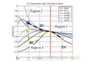 黑虛線代表負(fù)載變化期間的理想路徑,而綠虛線表示實(shí)際路徑。在負(fù)載從低變高的過(guò)程中,可以看到系統(tǒng)經(jīng)過(guò)ZCS區(qū)域,因此,寄生體二極管的性能變得非常重要。出于這個(gè)原因,新LLC設(shè)計(jì)的趨勢(shì)是使用體二極管恢復(fù)時(shí)間非常短的功率器件。