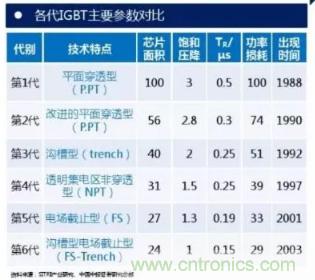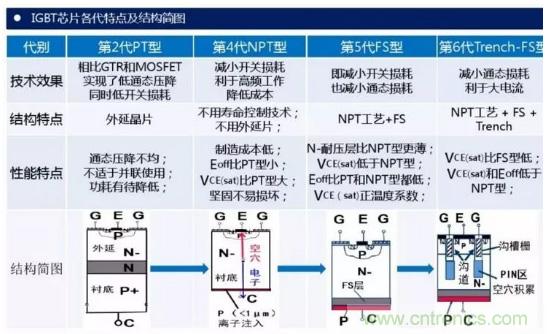 1985年前后美國GE成功試制工業(yè)樣品(可惜后來放棄)。自此以后, IGBT主要經歷了6代技術及工藝改進。