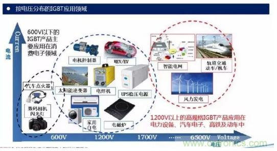 作為新型功率半導體器件的主流器件,IGBT已廣泛應用于工業(yè)、 4C(通信、計算機、消費電子、汽車電子)、航空航天、國防軍工等傳統(tǒng)產業(yè)領域,以及軌道交通、新能源、智能電網、新能源汽車等戰(zhàn)略性新興產業(yè)領域。