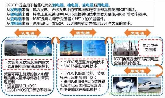 IGBT廣泛應用于智能電網的發(fā)電端、輸電端、變電端及用電端: