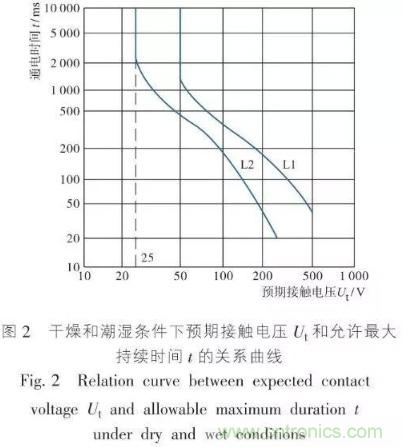 當(dāng)電流Ib通過人體阻抗為Zs時(shí),會(huì)產(chǎn)生電壓Ut,電壓Ut稱為接觸電壓,電流Ib是接觸電流,Ib越大,接觸電壓Ut也越大。實(shí)際工作時(shí),計(jì)算Ib較困難,而計(jì)算接觸電壓比較方便,于是IEC又提出在干燥和潮濕環(huán)境條件下相應(yīng)的預(yù)期接觸電壓Ut―通電時(shí)間t的曲線L1和L2(如圖2所示),這里預(yù)期的接觸電壓是最大的接觸電壓,為確保電氣安全和簡化計(jì)算,在實(shí)際應(yīng)用中,接觸電壓都采用預(yù)期接觸電壓。