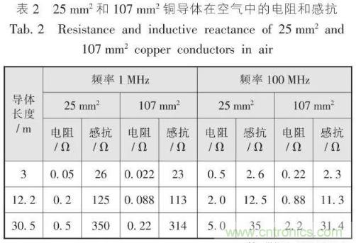 表2是電阻及電抗隨工作頻率變化而變化的關(guān)系。由表2可知:對于同一截面(如25 mm2)的銅導(dǎo)體在高頻1 MHz時(shí),其感抗量為電阻量的625倍;頻率為100 MHz時(shí),兩者的倍數(shù)高達(dá)6 250。當(dāng)導(dǎo)體截面增大為107 mm2、頻率為1 MHz時(shí),其感抗量為電阻量的1 284倍;頻率為100 MHz時(shí),兩者的倍數(shù)高達(dá)12 840。