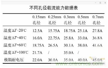 表2 17.5μm外層/35μm內(nèi)層銅箔的PCB上不同孔徑載流能力數(shù)據(jù)表